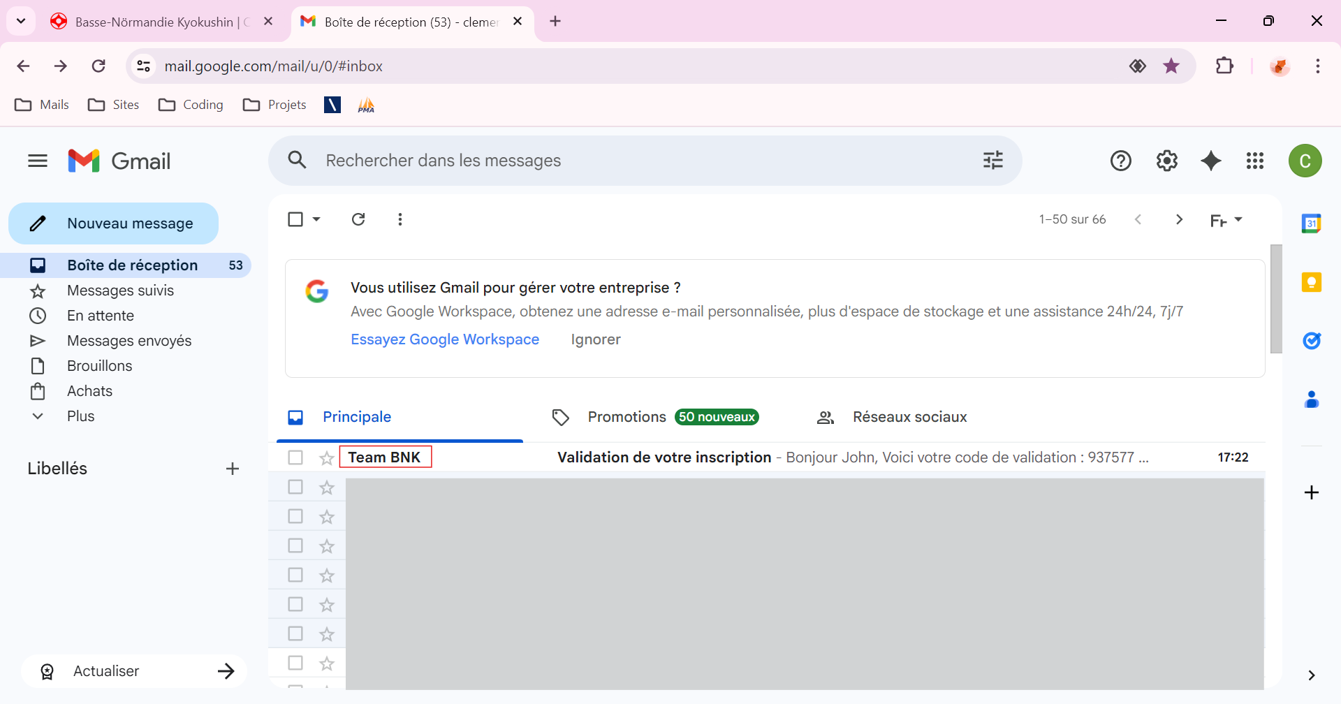 • Rendez-vous sur votre boîte mail (correspondant à l'adresse mail que vous avez entrée), cliquez sur le mail de "Team BNK" :