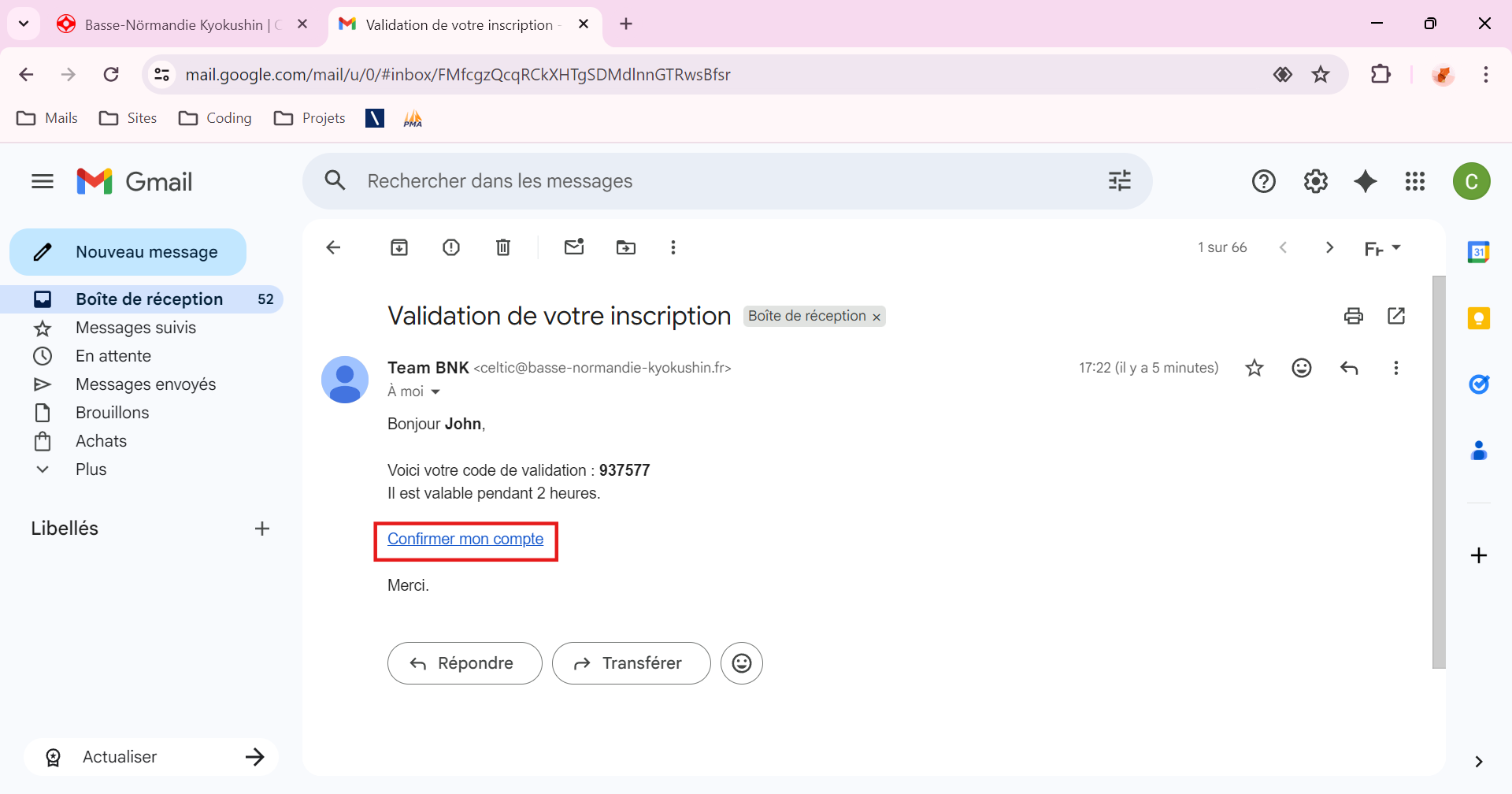 • Ouvrez ensuite ce mail et cliquez sur "Confirmer mon compte" (Attention : code valable 2 heures) :