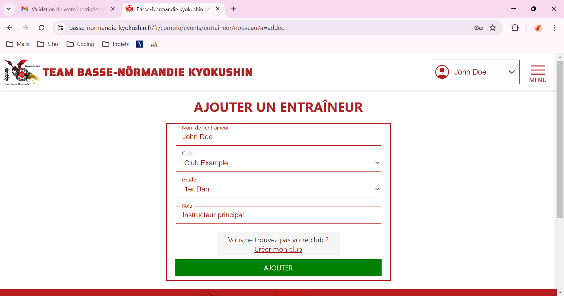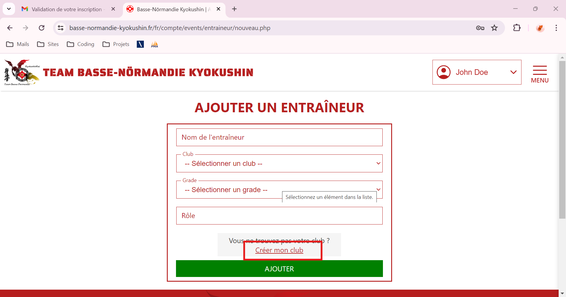 • Vous revenez sur la page de création de votre compte Entraîneur, remplissez tous les champs, puis cliquez sur "Ajouter" :