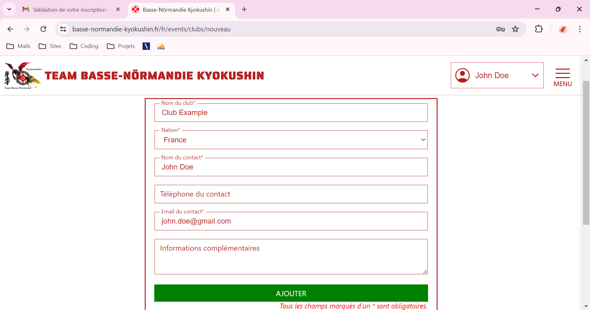 • Vous arrivez sur la page de création de votre club, rentrez les informations obligatoires, au moins, puis cliquez sur "Ajouter" :