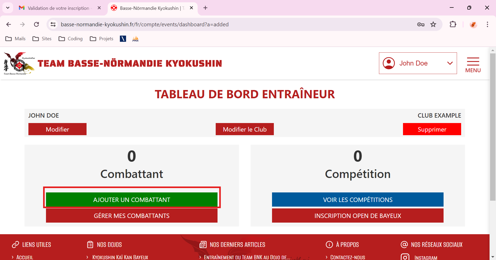 • Vous revenez sur votre Tableau de Bord Entraîneur, cliquez sur "Ajouter un Combattant" :