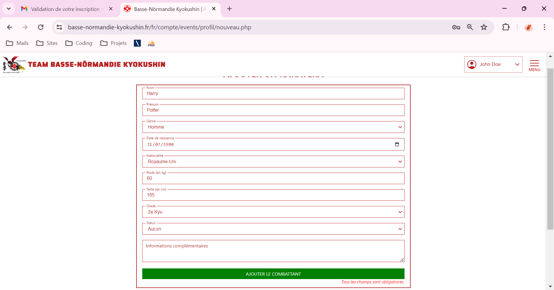 • Vous arrivez sur la page de création d'un karatéka, remplissez tous les champs obligatoires puis cliquez sur "Ajouter le Combattant" :