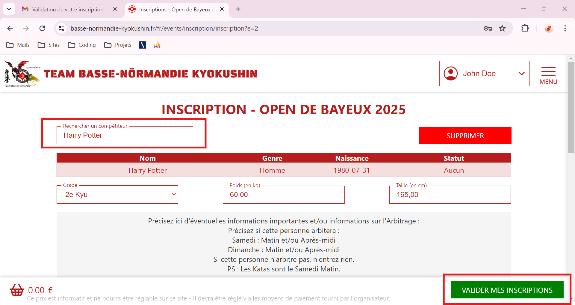 • Vous arrivez sur la page d'inscription à l'Open de Bayeux, sélectionnez votre compétiteur via "Rechercher un Compétiteur" puis sélectionnez les catégories, etc., puis cliquez sur "Valider mes inscriptions" :